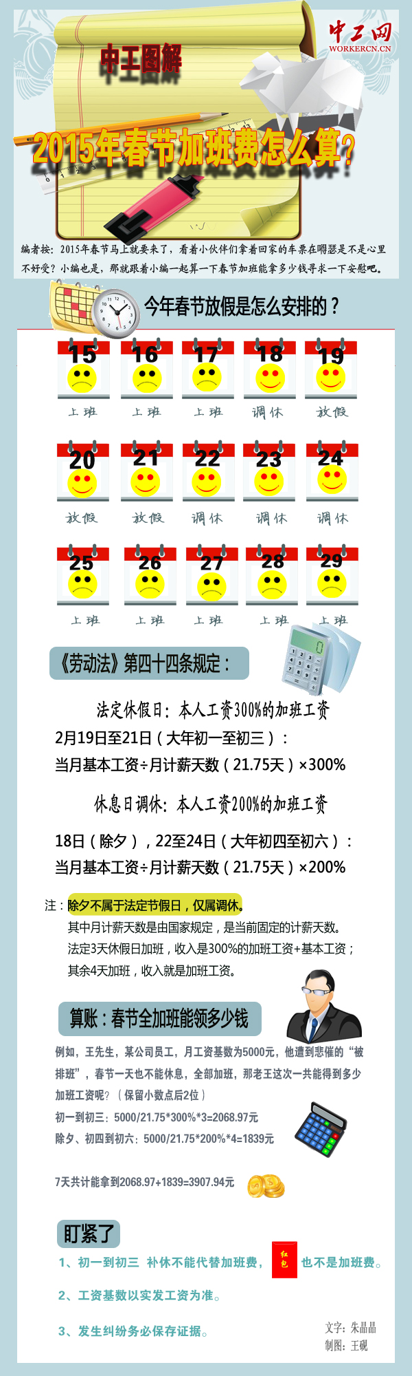 2015年 春节7天假其实由两部分组成,即法定节假日和休息日。2月19 日、2月20日和2月21日是法定节假日,用人单位在这三天安排劳动者工作,应按不低于劳动者本人日或小时工资的300%支付加班工资。2月18日、2月22日、2月23日和2月24日是休息日,在此期间安排加班的,如不能补休,按照200%支付加班工资。