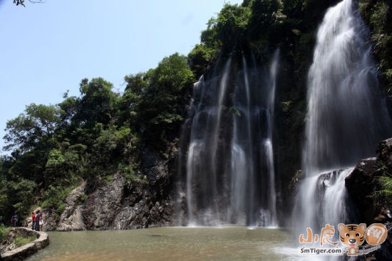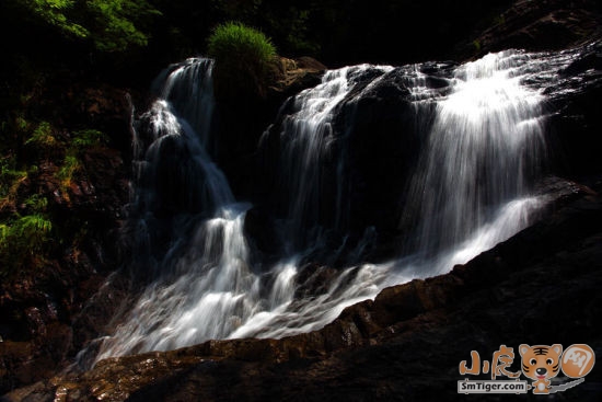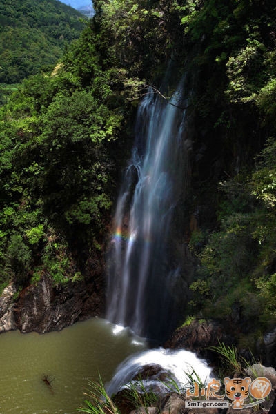 我们艰难行走,忽然轰隆的声音由弱到强灌入耳鼓,我们不由为之一振,极目远眺:“啊”,向往已久的瀑布就在眼前,瀑布从悬崖绝壁直泻下来,倾珠泻玉,像少女头上的白纱布,又似天穹无暇的浮云,纵有“雪练拖穹,银云垂地”之词,也无法形容其姿色。 瀑流撞击着突兀的岩石,飞花翠玉般四溅开去,宛如一道流动的诗,我不禁诗性大发地呤上两句“天宫宝库何年漏,不尽珍珠滚滚来。”走上前去,凉风夹杂着迷蒙的水雾扑面而来,我们受宠若惊,尽情地享受大自然的亲吻和洗礼……